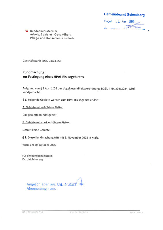 Hier finden Sie die aktuellen und gültigen Verordnungen und Verlautbarungen. Bei Fragen stehen Ihnen die Mitarbeiterinnen und Mitarbeiter des Gemeindeamtes gerne zu den Amtszeiten zur Verfügung.