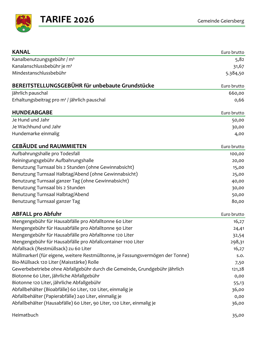 (z.B. Gebührenverordnung, Feuerwehr-Gebührenordnung, Freizeitwohnungspauschale, Kanalgebührenordnung, Abfallgebührenverordnung, Kindergartentarifordnung,